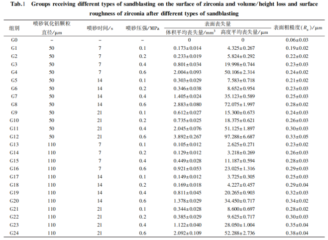 當噴砂顆粒尺寸及噴砂壓強恒定時,隨著噴砂時間的增加,氧化鋯粗糙度均顯著增加。當噴 砂時間及噴砂顆粒大小恒定時,隨著噴砂壓強增大,氧化鋯表面粗糙度也均隨之增加。對于噴砂顆粒大小而言,當噴砂時間及噴砂壓強保持恒定,50μm噴砂顆粒噴砂后的氧化鋯表面 損失量顯著高于110μm噴砂顆粒噴砂后的氧化鋯表面損失量。噴砂可以導致氧化鋯表面損失;噴砂壓強越大、噴砂時間越長,氧化鋯表面損失量越多,其表面粗糙度越大。但也有研究表明,噴砂技術存在一定的隱患,大顆粒的噴砂可能導致氧化鋯修復體較為薄弱的部分發生碎裂以損壞。