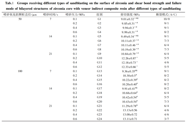噴砂壓力為0.2、0.4及 0.6MPa時氧化鋯與間接修復樹脂界面的粘結強度顯著高于噴砂壓力為 0.1MPa時界面的粘結強度。但是粘結強度在噴砂壓力為 0.2、0.4及 0.6MPa時并沒有顯著變化。 同是,有相關文獻證實隨著噴砂壓力的增加,氧化鋯表面出現微裂紋或者缺陷的可能性隨著增加,從而降低氧化鋯強度,導致失敗,也有研究顯示經車針研磨30秒后單斜晶體含量增加3%-5%,經4bar噴砂15秒后單斜晶體含量增加13%-15%,這種轉化可以導致氧化鋯的劣化,所以并不是噴砂顆粒越大,時間越久,壓強越大,表面粗糙度越大就越好。